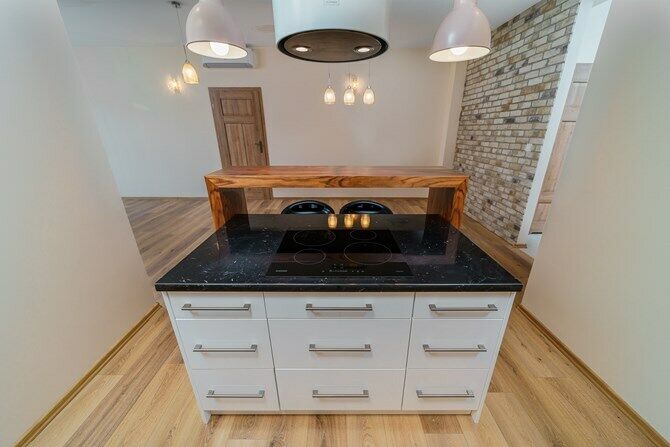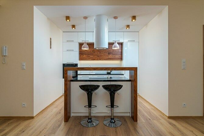 Oddzielna kuchnia z kontuarem i miejscem do spożywania posiłków.