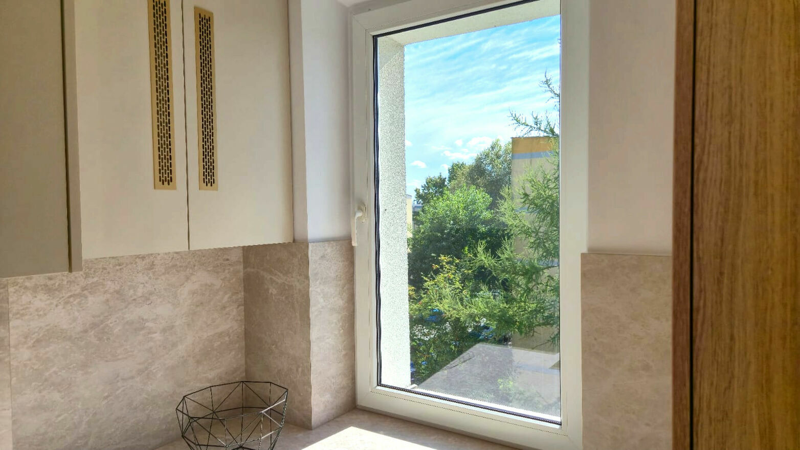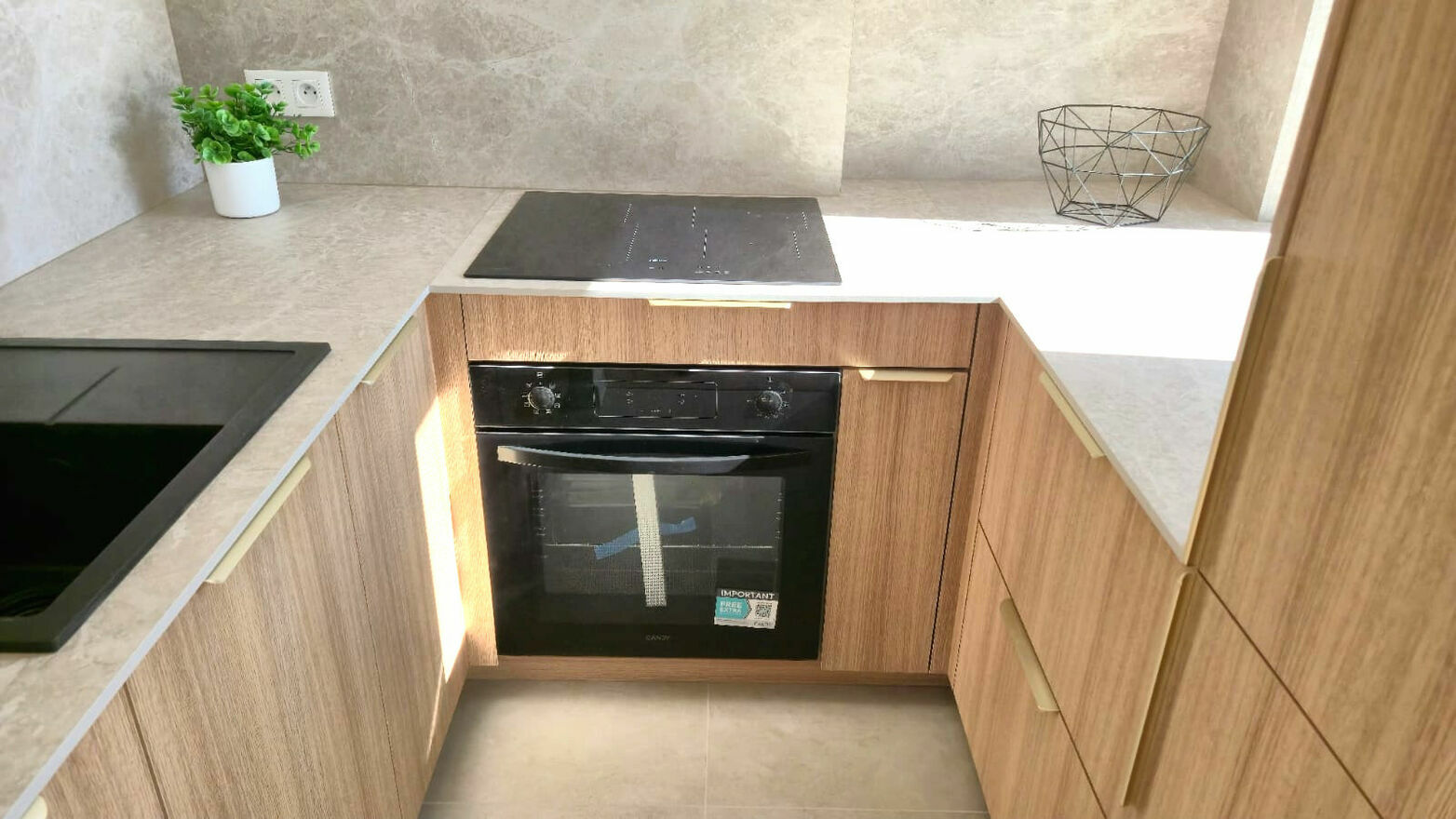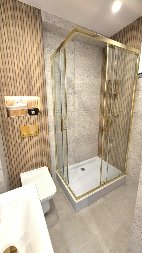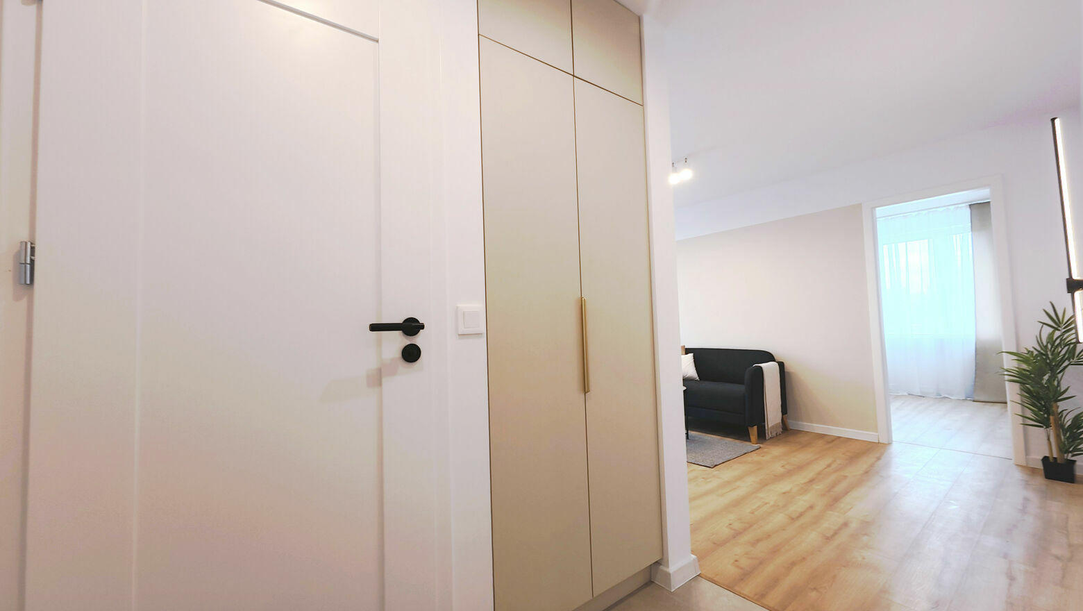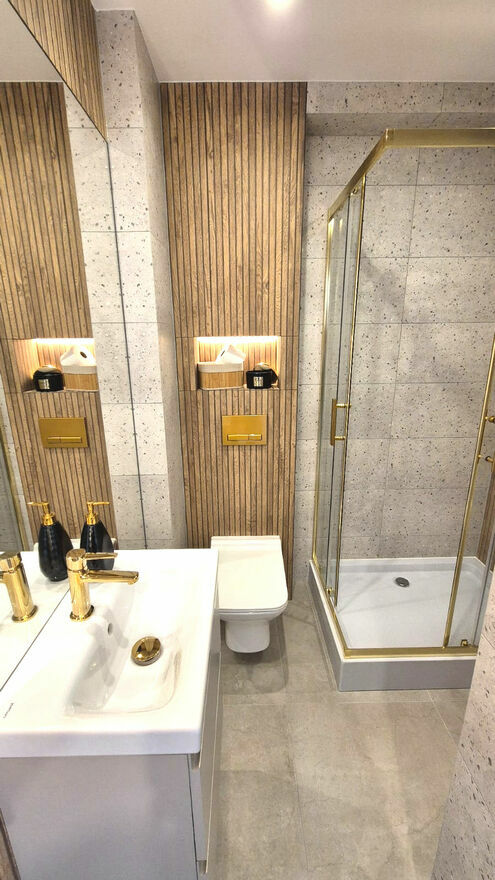 Kuchnia została wyposażona w nową zabudowę z cichym domykiem oraz nowy sprzęt AGD w cenie mieszkania, w tym płytę indukcyjną, piekarnik i okap. W łazience znajduje się duży prysznic o wymiarach 100 x 70 cm, nowa ceramika sanitarna, szafka z umywalką, misa WC oraz bojler marki Ariston. Przewidziano również miejsce na pralkę. W przedpokoju zamontowano dużą szafę oraz szafkę na buty, a w salonie znajduje się szafka RTV.