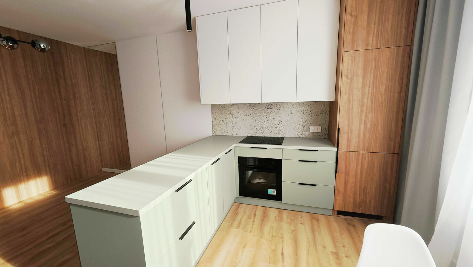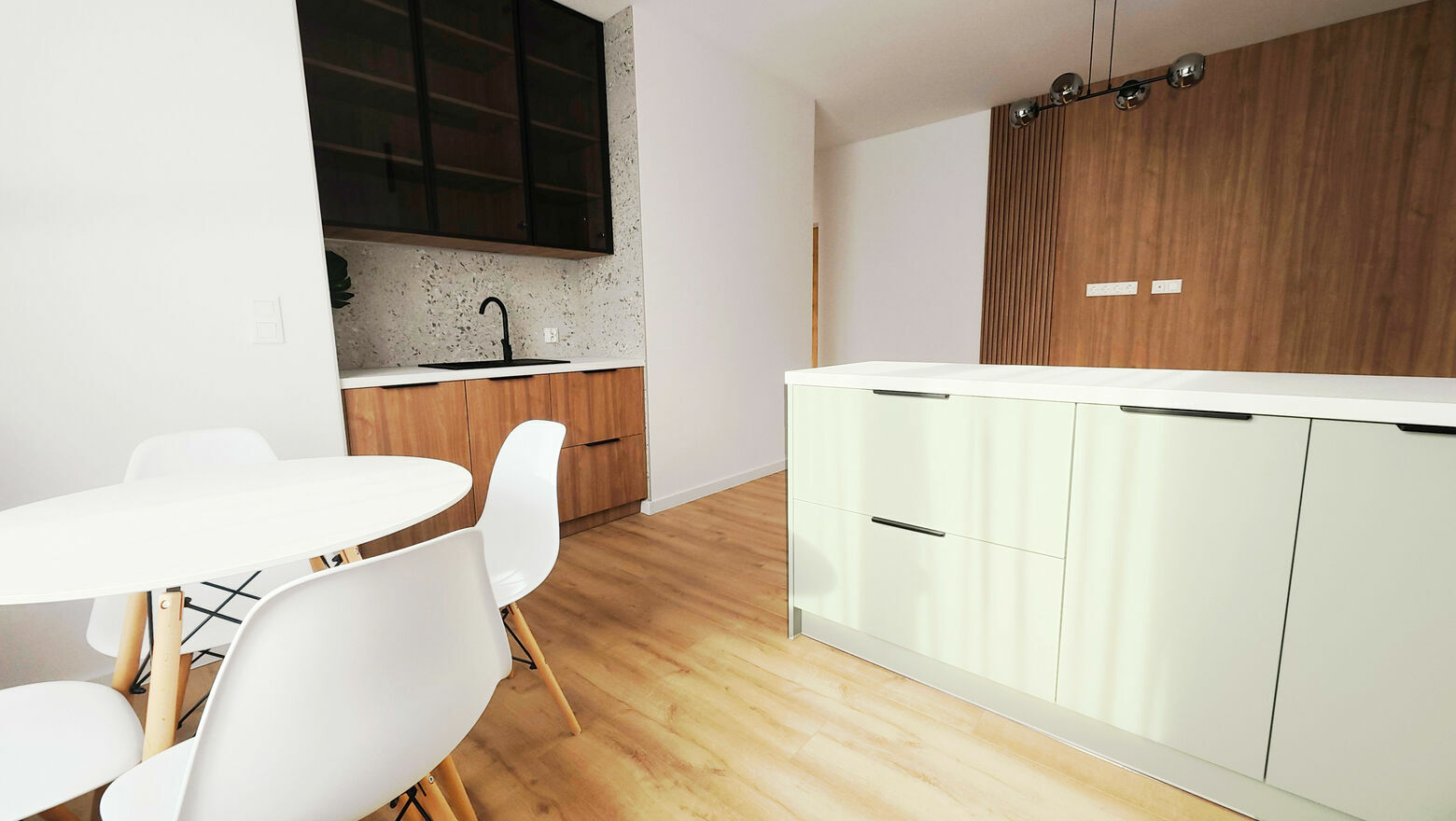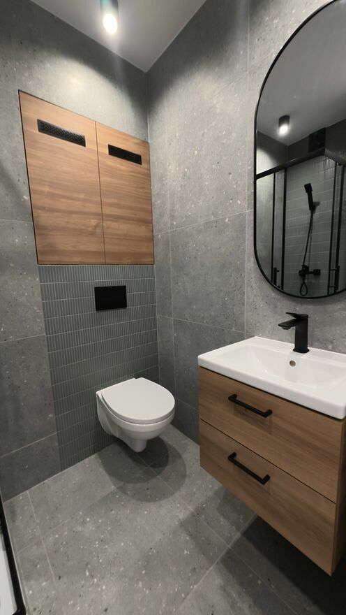 Remont został wykonany kompleksowo, z wymianą instalacji elektrycznej i hydraulicznej, nowymi wylewkami, gładziami i malowaniem farbą premium. Zainstalowano nowe drzwi, oświetlenie LED, panele podłogowe i listwy, lustra czy szafy w zabudowie – wszystko utrzymane w nowoczesnym, spójnym stylu. Łazienka została urządzona od podstaw, z dużym prysznicem, elegancką ceramiką i bojlerem Ariston. W kuchni znajduje się nowa zabudowa na wymiar z systemem cichego domyku oraz zupełnie nowe AGD – piekarnik, płyta indukcyjna i okap. W mieszkaniu przygotowano miejsce na pralkę oraz podłączenie telewizji w każdym pokoju, a szybki światłowód doprowadzony jest bezpośrednio do lokalu.