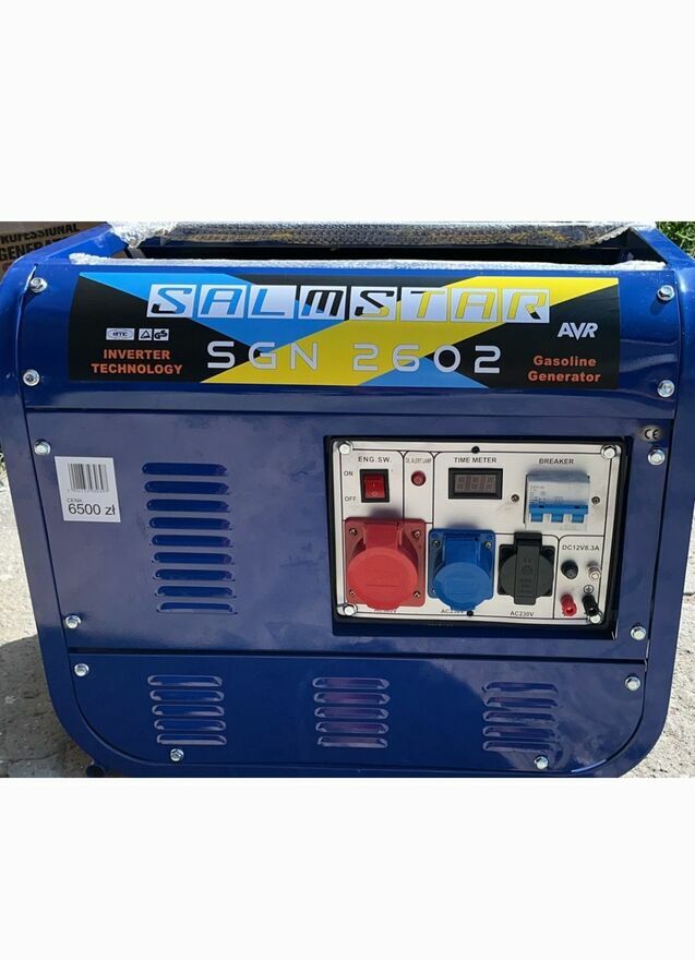 Agregat prądotwórczy do pracy ciągłej SALMSTAR SGN 2602 6,7 kW AVR 3 FAZY 230V 400V z 4-suwowym silnikiem benzynowym. Model gwarantuje identyczną moc w obu trybach pracy co umożliwia zasilanie urządzeń zarówno jednofazowych, jak i trójfazowych. Obudowa dźwiękochłonna pozwala zredukować poziom hałasu, co sprawia, że długotrwałe użytkowanie staje się o wiele bardziej komfortowe. Koła ułatwiają transport urządzenia. Posiada system AVR ( Automatic Voltage Regulation) do automatycznej regulacji napięcia wyjściowego. Technologia ta wykorzystywana jest nie tylko w wybranych modelach agregatów prądotwórczych, ale również zasilaczach awaryjnych UPS. Dzięki technologii AVR, możemy podłączyć do agregatu czułe na wszelkie wahania napięcia, urządzenia elektroniczne, RTV i AGD. Działanie systemu AVR jest względnie proste. Agregat prądotwórczy wyposażony jest w prądnicę synchroniczną i wytwarza prąd elektryczny o stałym napięciu, bez względu na chwilowe obciążenie. Zalety agregatu SALMSTAR SGN 2602;Bardzo wydajne wytwarzanie energii elektrycznej Niezawodne urządzenie rezerwowe Chłodzenie powietrzem Łatwy w użyciu Stabilny prąd przez AVR Zabezpieczenie przed przeciążeniemCechy dodatkowe