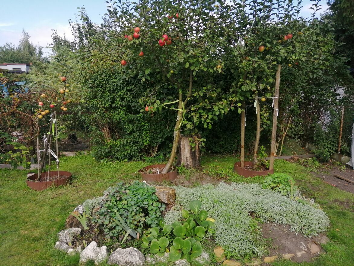 * drzewa owocowe: 3 jabłonie, śliwka