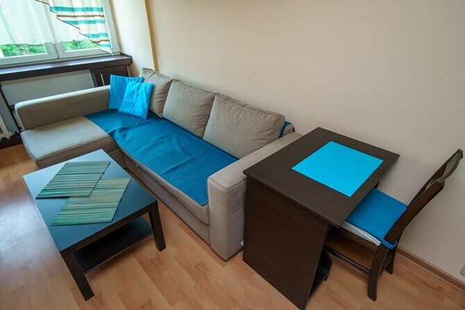 Pokój: duży rozkładany narożnik z funkcją spania i pojemnikiem na