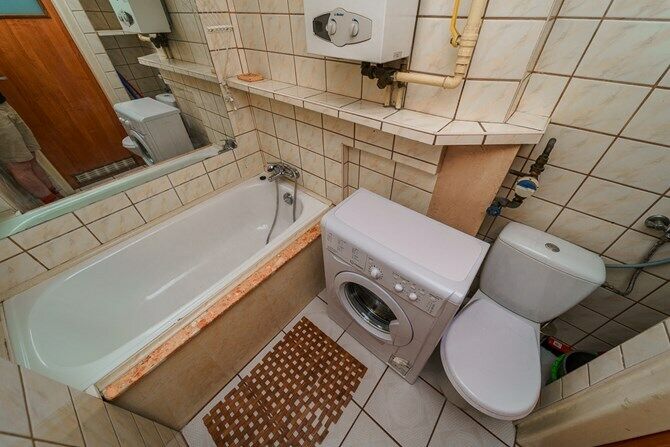 Łazienka: wanna, WC, pralka.