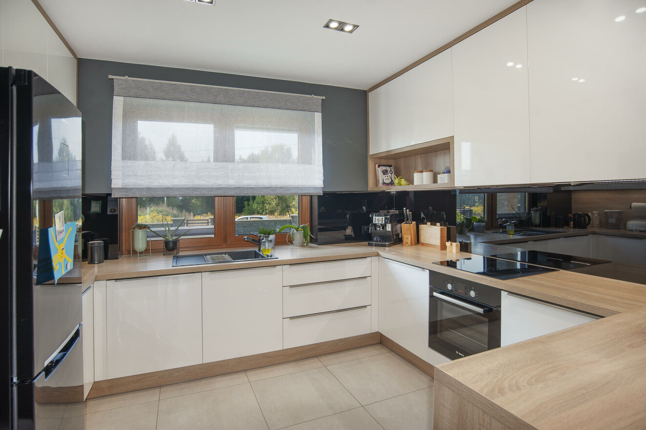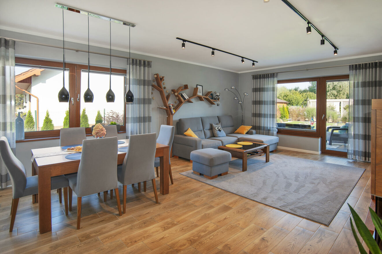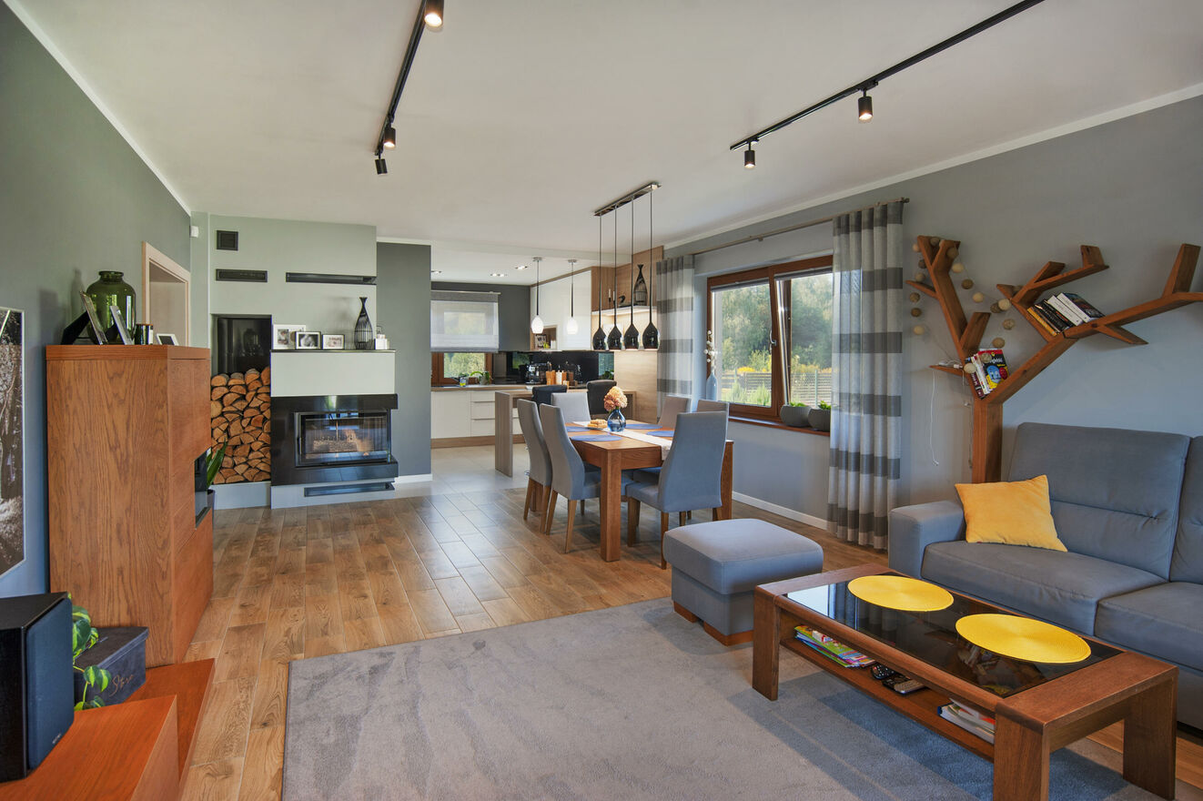 - przestronny salon z jadalnią i kuchnią - serce domu z wyjściem na zadaszony taras i pięknie zagospodarowany ogród,