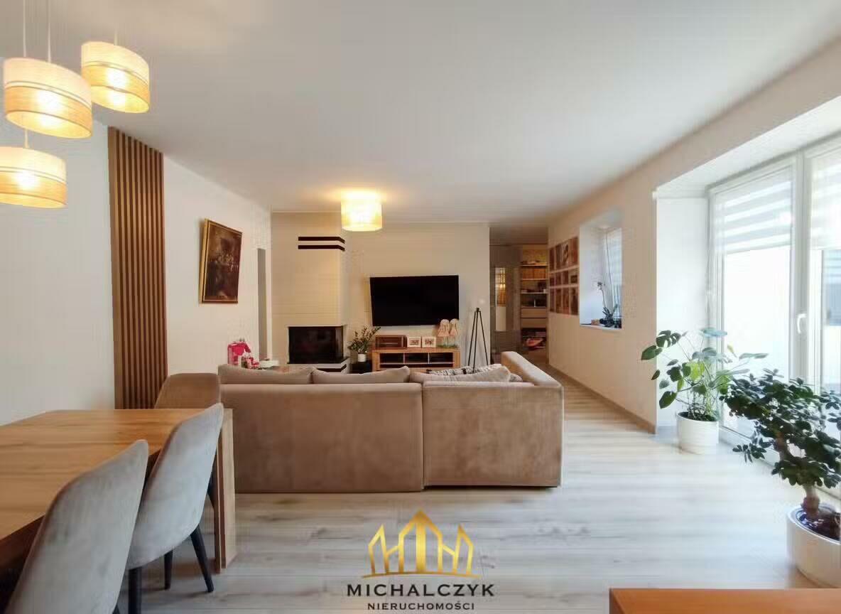 - Przestronny salon z kominkiem, połączony z jadalnią i aneksem kuchennym