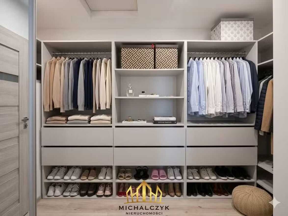 - Duża garderoba ukryta za przesuwnymi drzwiami z lustrem