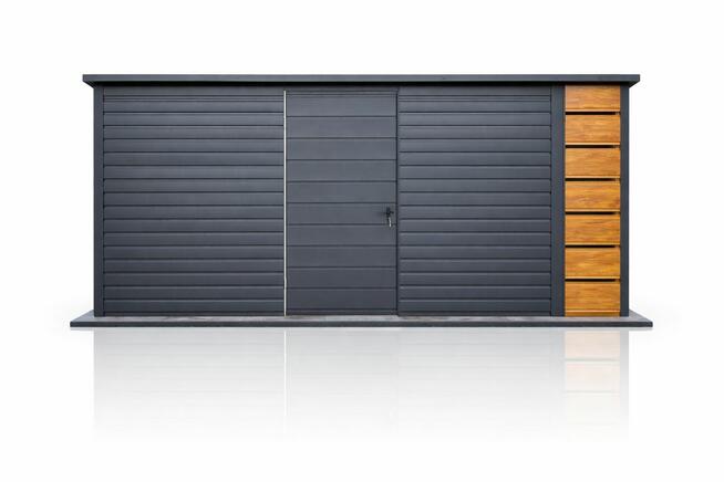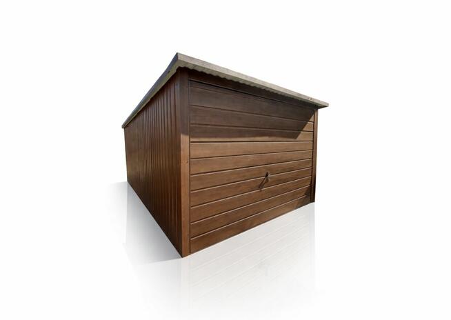 Garaż blaszany o wymiarach 3x5 m w kolorze drewnopodobnym z dachem jednospadowym i bramą uchylną Konstrukcja wykonana z ...