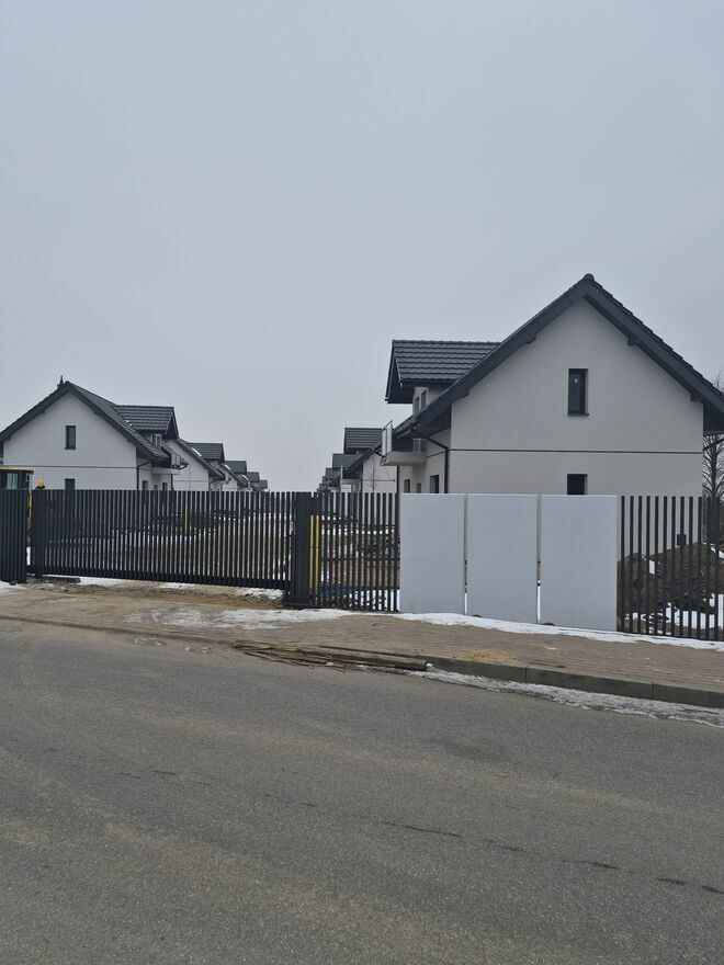 - wydzielenie działek pomiędzy domami płotem panelowym wraz w furtką z domofonem i bramą dwuskrzydłową na pilota,