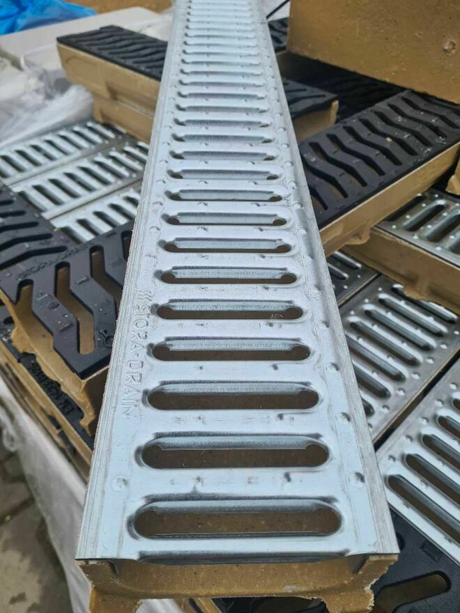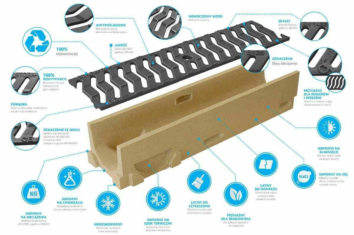 W sprzedaży:Odwodnienie liniowe A15/1,5t ruszt ocynk. Koryto z polimerobetonu odporne na chemikalia,mróz,sól.Łatwe w montażu. Producent STORA-DRAIN.