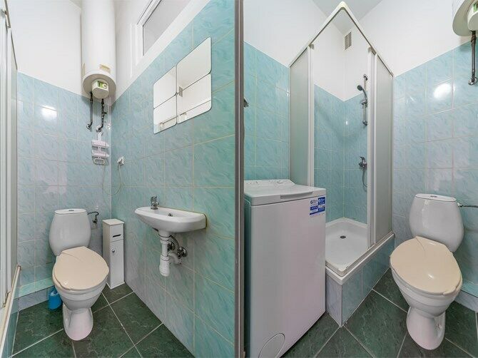 Łazienka: kabina prysznicowa, WC, umywalka, pralka.