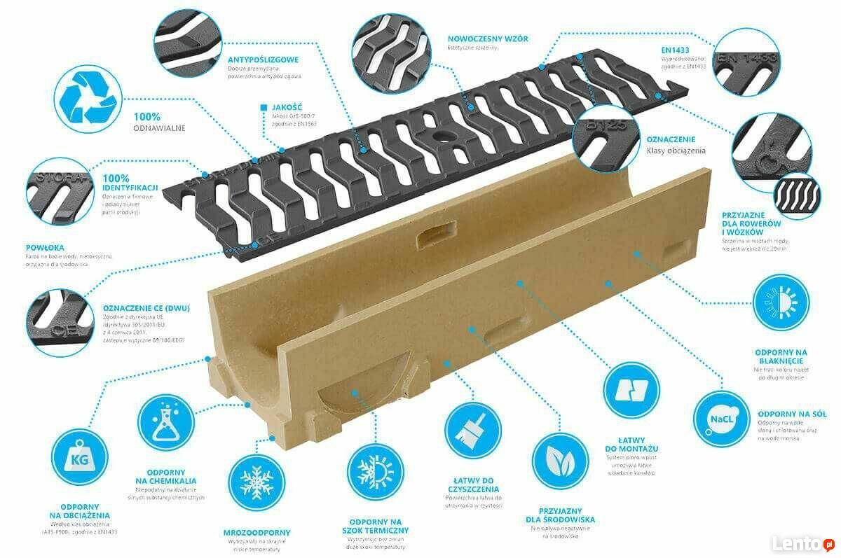W sprzedaży:Odwodnienie liniowe B125/12,5t ruszt żeliwo antypoślizgowy. Koryto z polimerobetonu odporne na chemikalia,mróz,sól.Łatwe w montażu. Producent STORA-DRAIN.