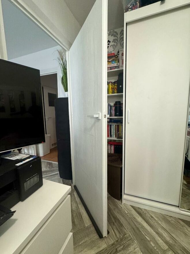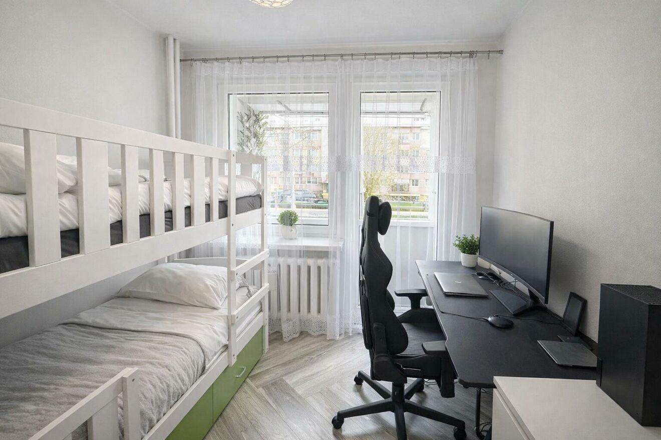 Sypialnia / drugi pokój: duża, nowa szafa trzyczęściowa z lustrem łóżko piętrowe biurko z krzesłem regał na książki komoda wyjście na balkon