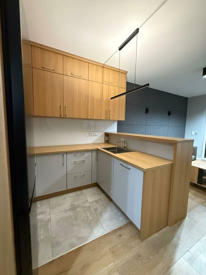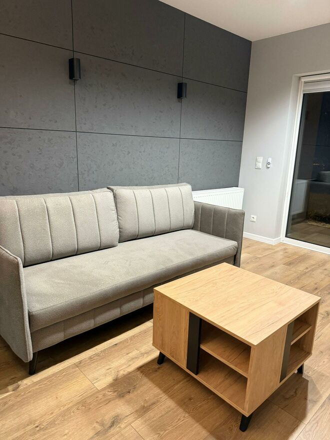 Wygodny salon z aneksem kuchennym tworzy serce mieszkania miejsce na odpoczynek, gotowanie i spotkania. Z salonu prowadzi wyjście do prywatnego ogrodu, który latem staje się naturalnym przedłużeniem strefy dziennej.