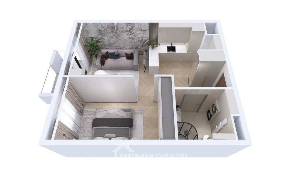 salon z aneksem kuchennym, sypialnia, łazienka.