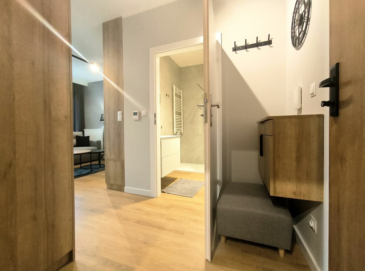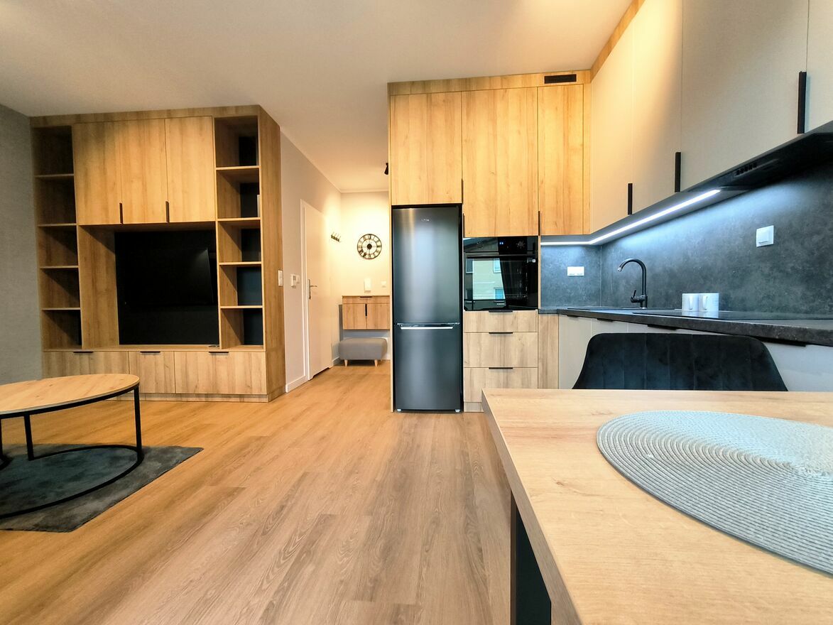 Kuchnia otwarta na salon z meblami na wymiar i agd . Elegancka łazienka z kabiną prysznicową, oraz przedpokój z zabudowana szafą.