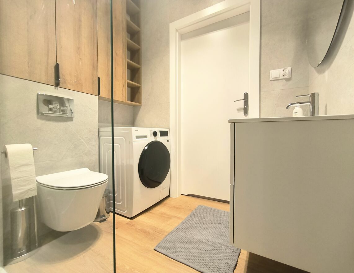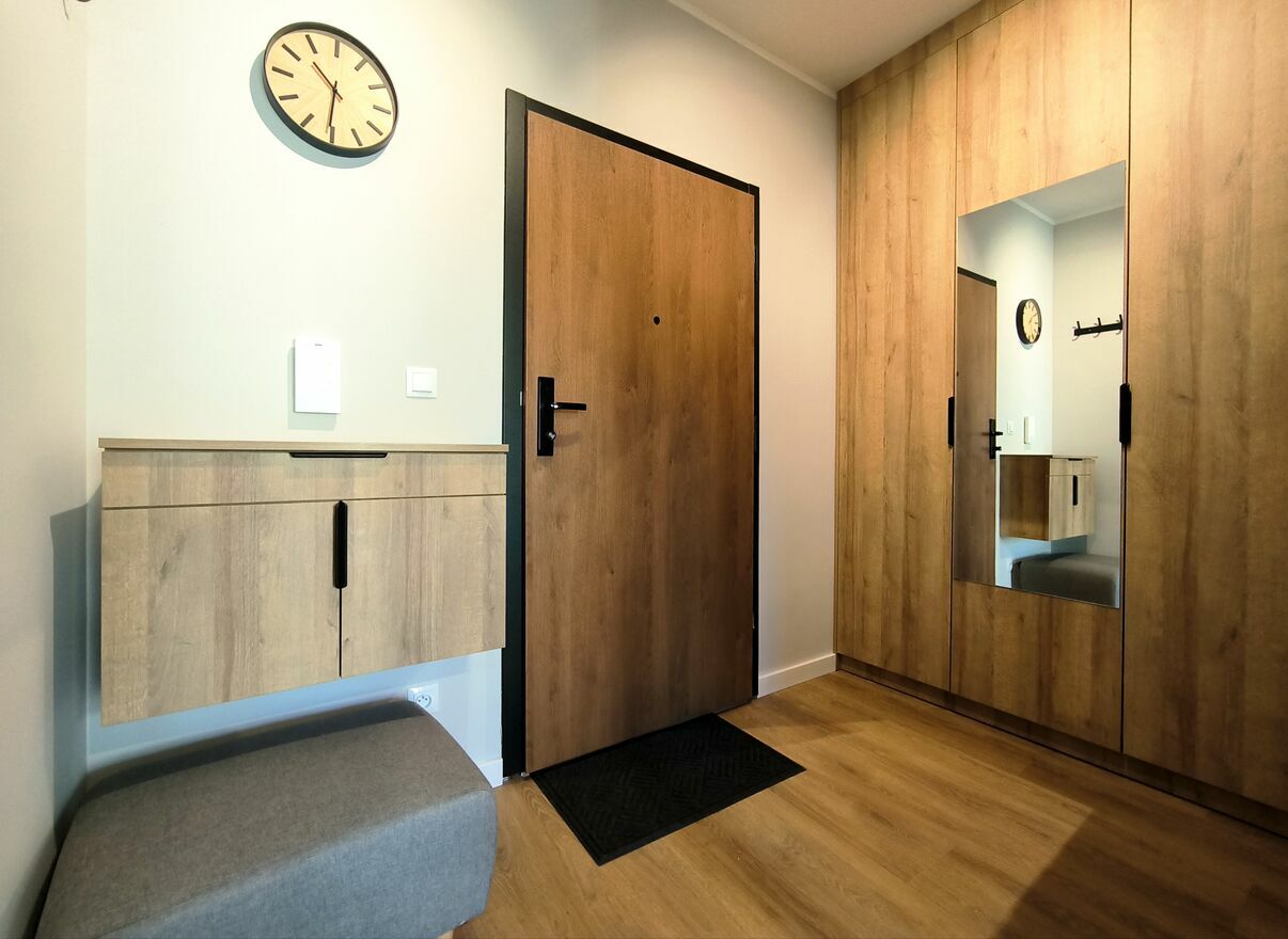 Kuchnia otwarta na salon z meblami na wymiar i agd . Elegancka łazienka z kabiną prysznicową, oraz przedpokój z zabudowana szafą.