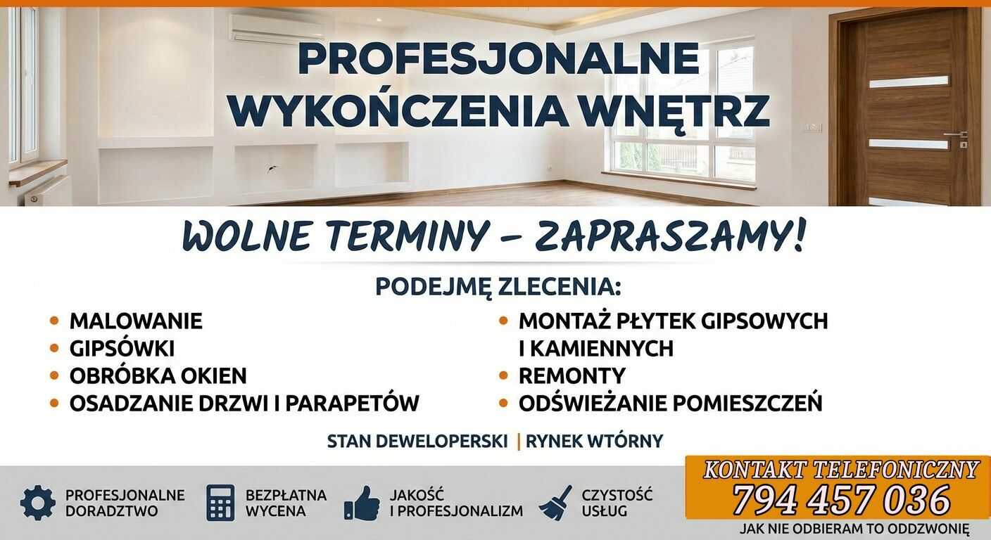 Planujesz remont mieszkania lub odbierasz klucze od dewelopera? Skorzystaj z usług doświadczonego fachowca, dla którego jakość i detale mają znaczenie. Oferuję kompleksowe usługi wykończeniowe na terenie [Wpisz Miasto/Okolicę].Zakres moich usług obejmuje: