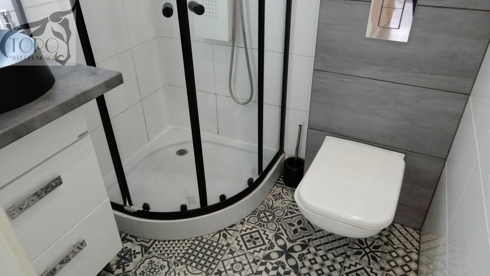 - łazienki (na ścianach glazura, podwieszany sufit, na podłodze gres, prysznic, umywalka nablatowa, szafka, wc podtynkowe, ogrzewanie podłogowe, około 2,5m2)