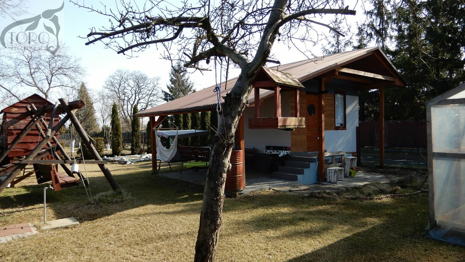 Istnieje osobno możliwość sprzedaży praw do działki ROD znajdującej się przy tej samej ulicy w odległości około 200 m od domu (nie sąsiaduje z domem). Działka ma powierzchnię około 250 m2. Znajduje się na niej murowana podpiwniczona altana ogrodowa o powierzchni około 12,5 m2 z tarasem, szklarnia i drewniany domek dla dzieci. W altanie jest prąd, woda, toaleta z umywalką.