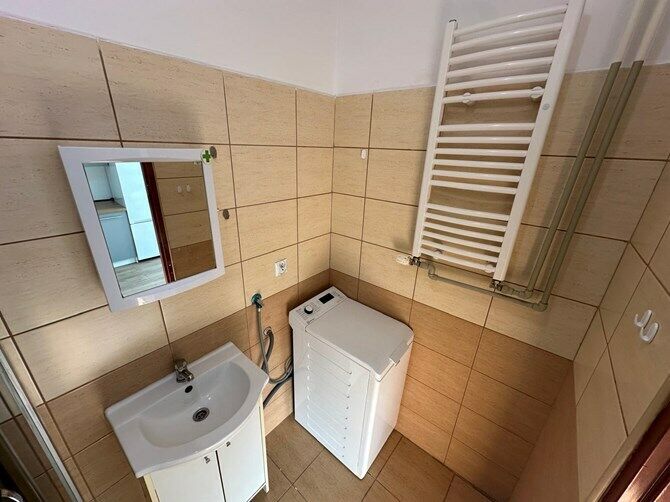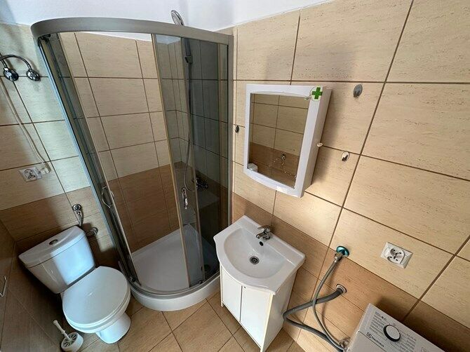 Łazienka: prysznic, pralka, toaleta, szafka z umywalką, lustro