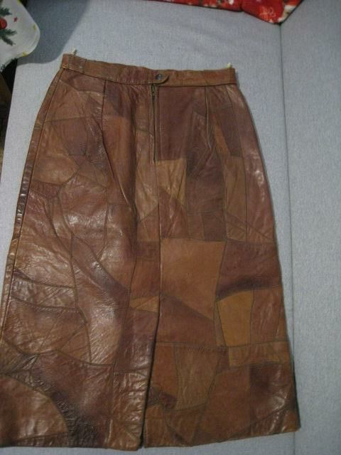 Sprzedam widoczną na zdjęciach spódnicę skórzaną z łatek. Kolor brązowy, Długość spódnicy 70 cm. Szerokość w pasie 70 cm.Lusia