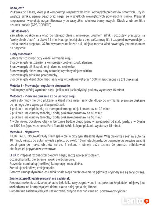 W wypadku gdy silniku pojawiły się problemy takie jak: lepkie pierścienie, nierówna kompresja, zwiększone zużycie oleju lub czarny dym, praca z preparatem powinna trwać ok 25-30 min zanim olej zostanie wymieniony.