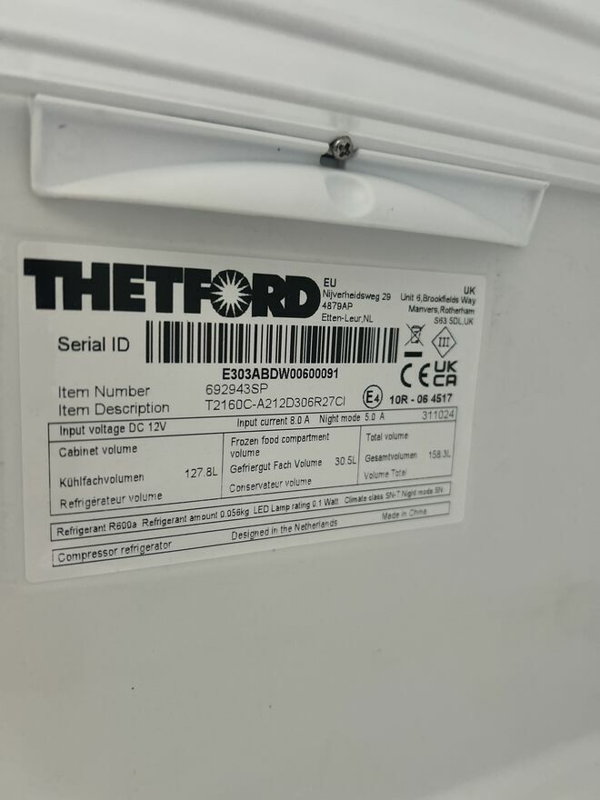 Powystawowa lodówka kompresorowa firmy Thetford model T2160C o pojemności 158L w tym zamrażarka o pojemności 30,5 lLodówka zasilana jest na 12V