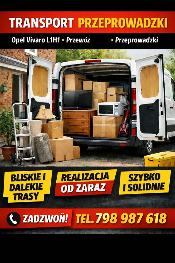PRZEWÓZ RZECZY • TRANSPORT • PRZEPROWADZKITransport przedmiotów i przeprowadzki samochodem Opel Vivaro L1H1.
