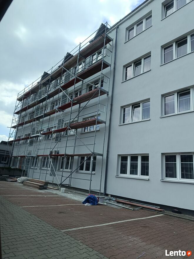 Mam do wynajęcia rusztowanie plettac elewacyjne do dociepleń/ budowlane do murowania. Można wejść na 2 poziomy do góry (nogi na poziomie 4-5metrów nad ziemią, wysokość głowy około 6-7 metrów nad ziemią). Zestaw można skonfigurować na różne sposoby- generalnie na raz wystarczy na jedną wysoką ścianę szczytową + jeden bok niższy. Wystarczy też przy murowaniu żeby zrobić obwód budynku do wysokości wieńca. Jest tego około 100m2W skład wchodzi: